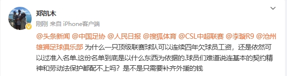 鄭凱木:“為什么一只頂級(jí)聯(lián)賽球隊(duì)可以連續(xù)四年欠球員工資,還是依然可以過準(zhǔn)入名單。這份名單到底是以什么東西為依據(jù)的?球員們難道說(shuō)連基本的契約精神和勞動(dòng)法保護(hù)都配不上嗎?是不是只需要補(bǔ)齊外援的錢?”
